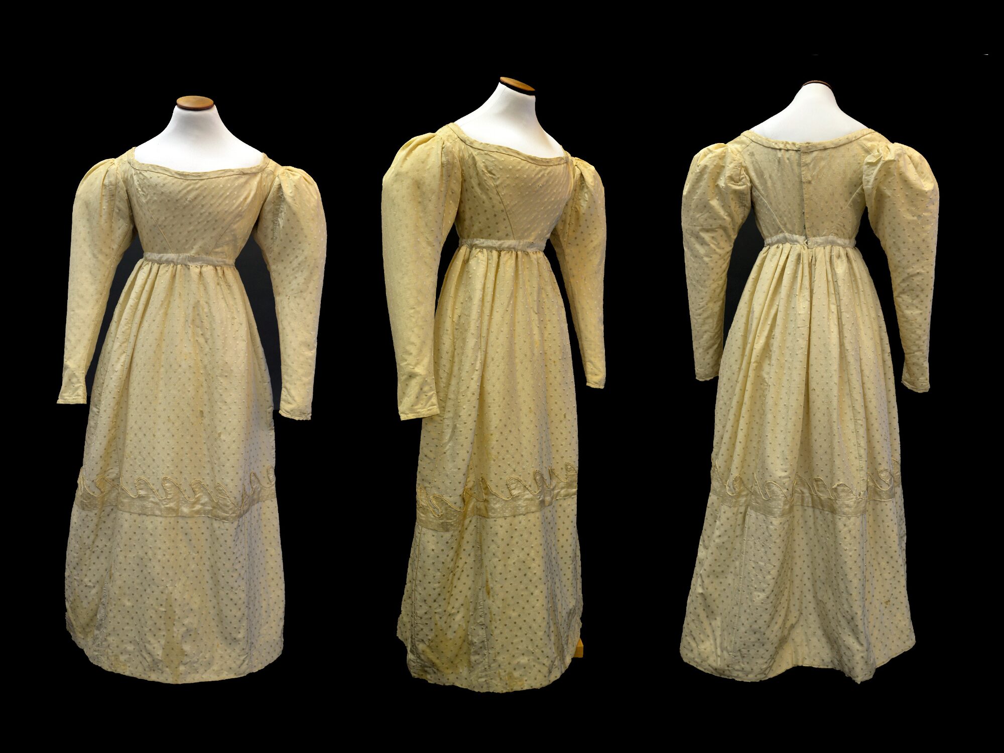 Dating from the late 1820s, it is made from pale yellow silk faille and has a woven dot pattern. The dress follows the stylistic trends of that time which were derived from classical Greek and Roman fashion. It was a time when rigid corsetry and compressed body shapes were replaced by a more relaxed style that allowed the body a more natural form.