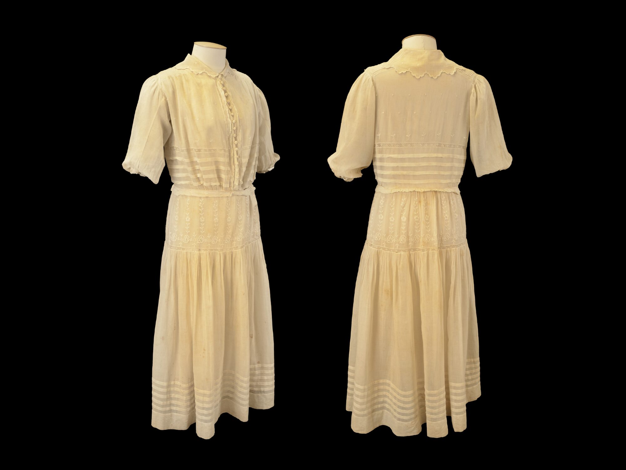 This example features a scalloped-edge embroidered collar, smocked shoulders and crochet-ball false buttons. Floral and leaf motif embroidery and lace inserts decorate the bodice and skirt, while horizontal tucks create a banded effect with the sheer muslin fabric.
