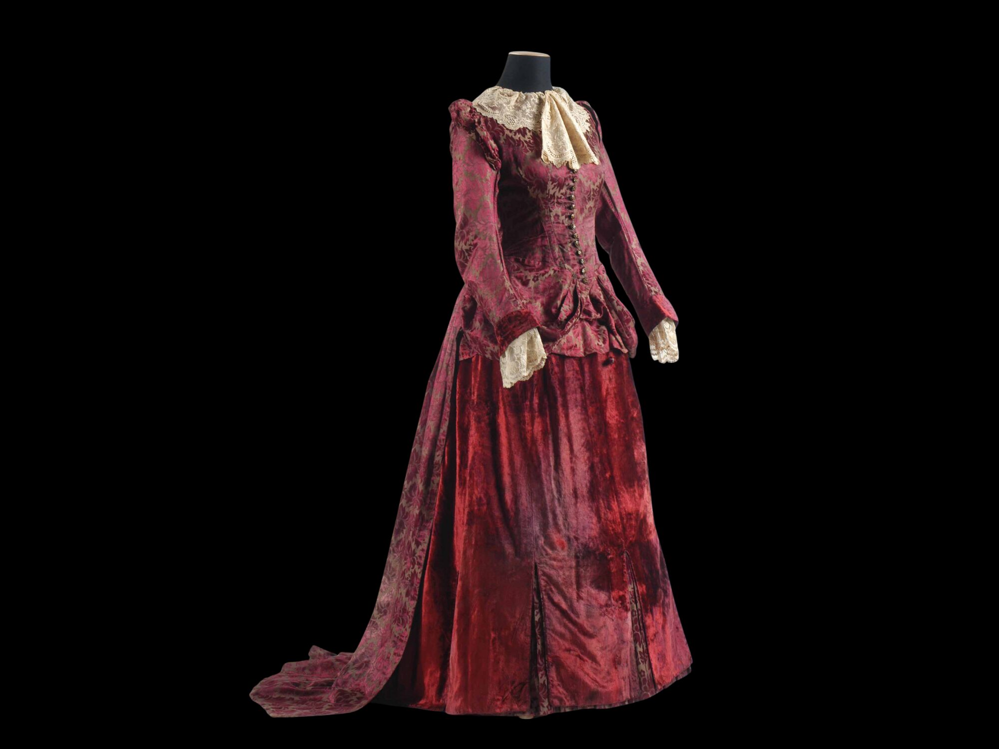 A ‘first day’ garment was always made of colourful fabric. This two-piece outfit consists of a boned jacket with a long train made from burgundy and brown silk damask and a matching velvet skirt. The inner, hidden fabric changes from luxurious silk and velvet to very ordinary cotton twill. Luxury materials were enormously expensive to buy and import to New Zealand in the 1860s, so economies were made where they would not be seen.