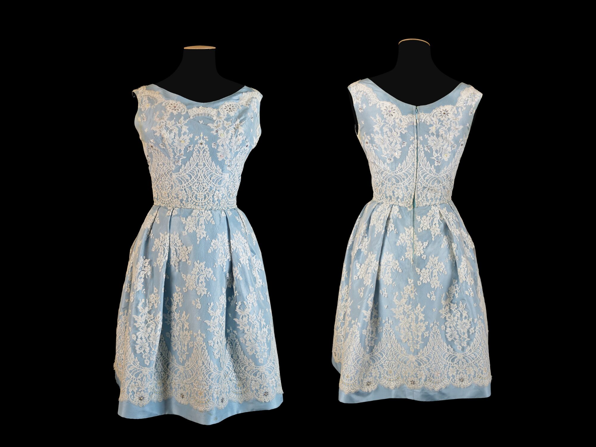 The design incorporates a blue silk base with white lace overlay. Aspects of the lace are highlighted with sparkling sequins, grey and clear glass bugle beads and pearl beads. Pleats at the hips add subtle structure.